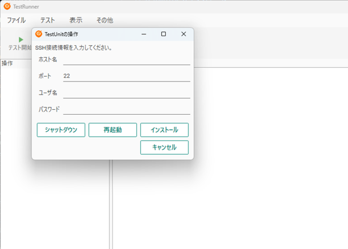 TestRunner が起動したら、画面左上の [その他] > [TestUnitの操作] をクリックします。 [TestUnitの操作] ダイアログが立ち上がります。