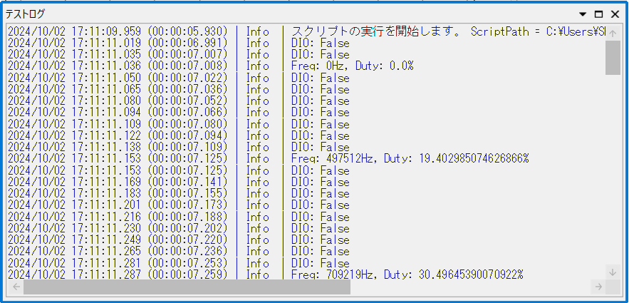 [テスト] > [スクリプトの実行] メニューから Python スクリプトを実行した際、Python からの標準出力・標準エラー出力を表示します。