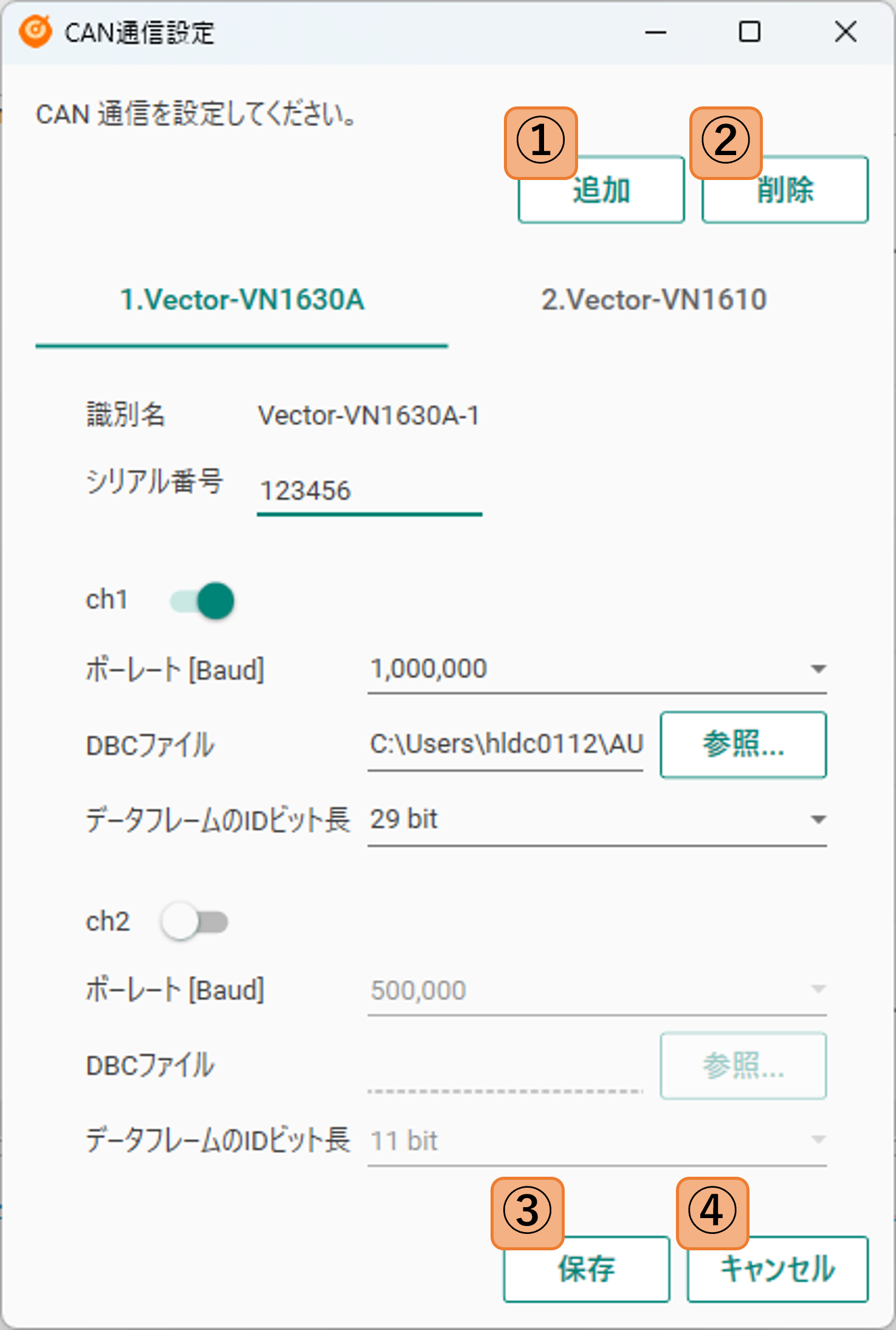 ⑥ [保存] ボタンでダイアログを閉じると、[CAN通信設定] ダイアログに選択したツール用の設定タブが追加されます。