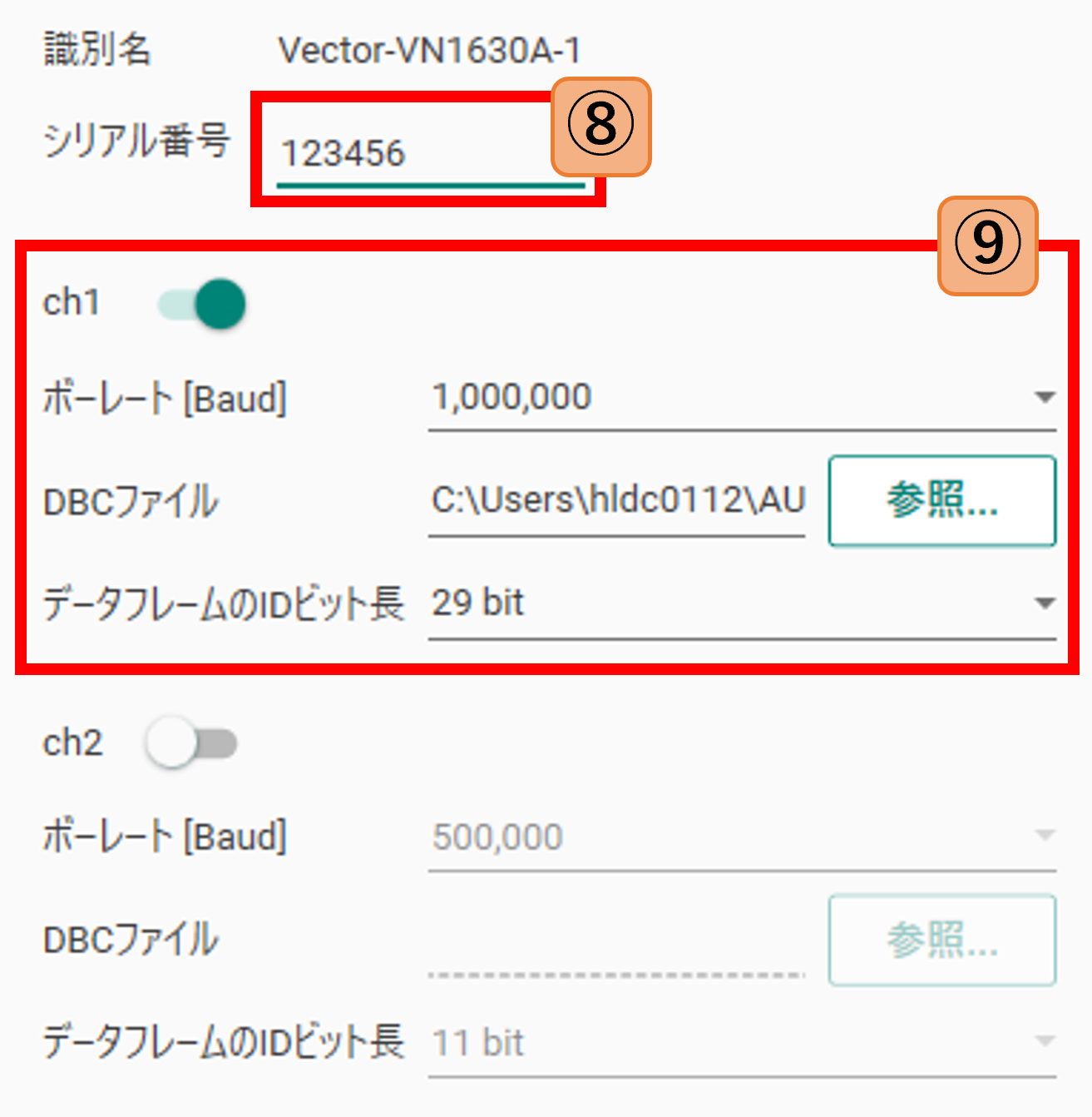 ⑧ [シリアル番号] テキストボックスに使用するデバイスのシリアル番号を入力してください。