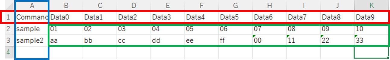 一行一列目を除くヘッダ行は GUI には反映されません。任意の文字を入力できます。 - (青枠) コマンド名を任意で入力します。,(カンマ) や ”(ダブルクォーテーション) を含まない任意の文字列を指定できます。