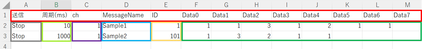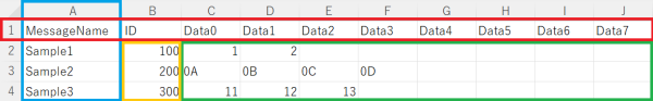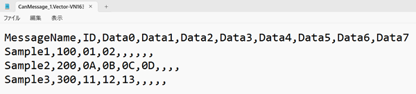 CAN 手動送信パネルで定義したメッセージは `<プロジェクトルート>\Settings\CanMessage_X.csv (X は CAN 通信設定の識別名) に保存されます。