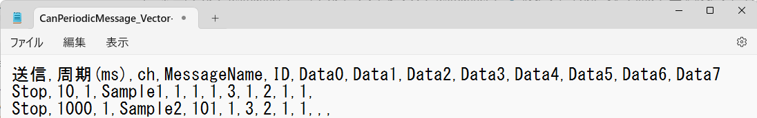 CAN 定期送信パネルで定義したメッセージは `<プロジェクトルート>\Settings\CanPeriodicMessage_X.csv (X は CAN 通信設定の識別名) に保存されます。