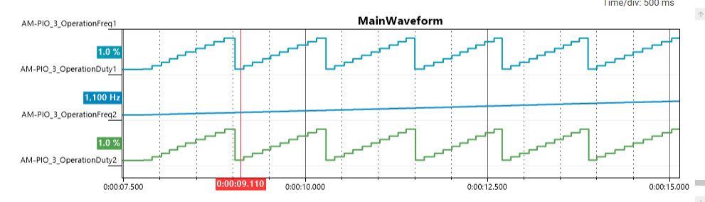 パルス入出力では、縦軸が制御・計測したパルスの周波数 (Hz)/Duty(%) を表します。ステップ型の折れ線で表示されます。周波数 / Duty はそれぞれ別トラックに表示されます。