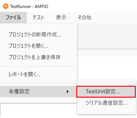 プロジェクトファイルを開いた状態で [ファイル] > [各種設定] > [TestUnit 設定] からダイアログを表示します。
