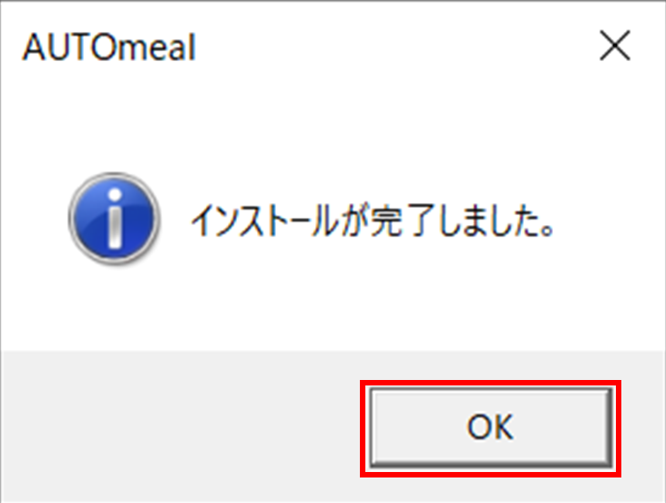 下記ダイアログが出たらインストールは完了です。 [OK] をクリックして閉じます。