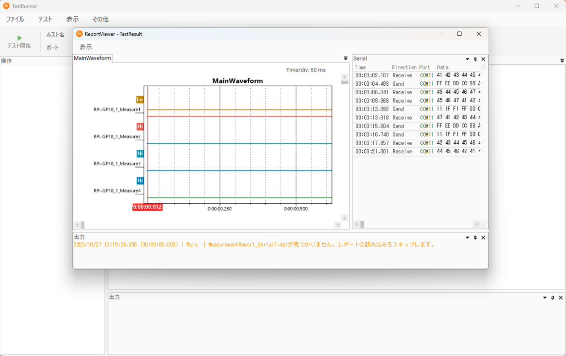 [テストログ] ペインに出力されたテスト実行時のテストログはレポートファイル内に記録されます。