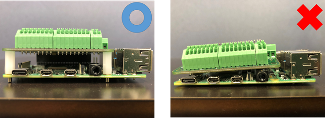 Raspberry Pi と AM-AO を重ね付けする際は、安定させるためにスペーサーを設置します。 端子台に高さがあるため、スペーサーで調整し、それぞれが干渉しないようにしてください。