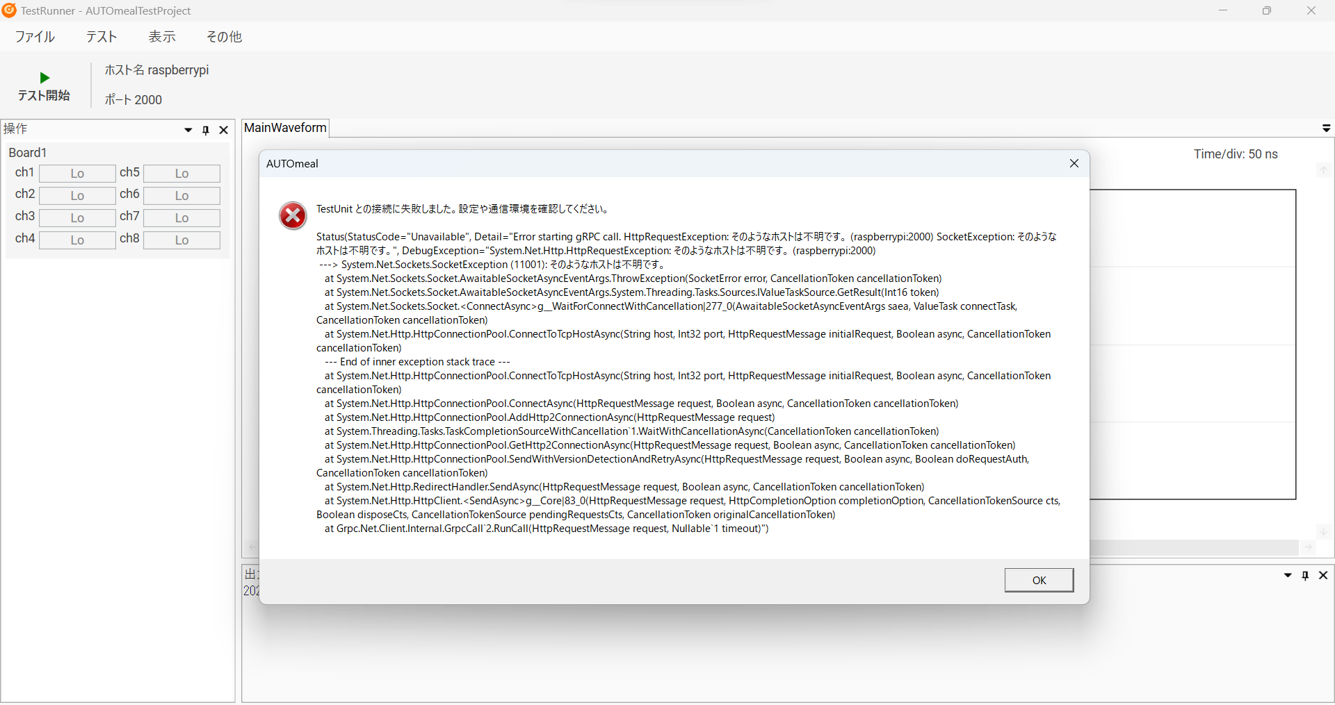 TestUnit との設定や接続に問題がある場合は、下図のようにエラーが表示されるため、設定及び接続を見直してください。