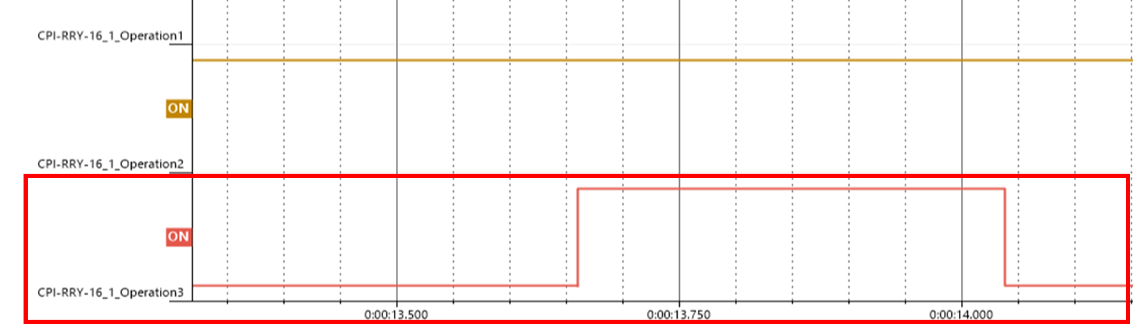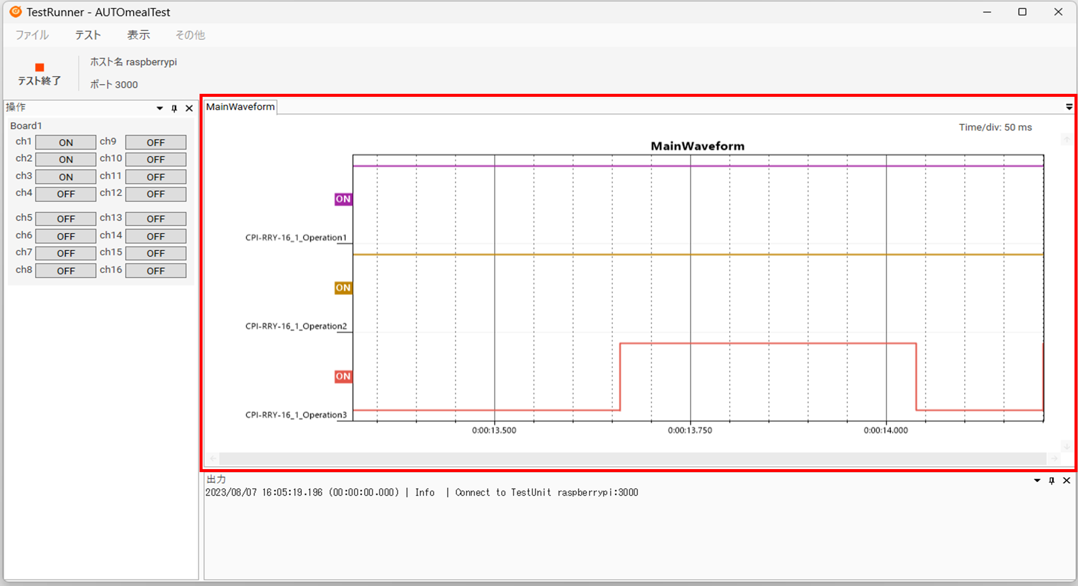 リレー制御の接点状態をアプリ上に表示される波形で確認します。