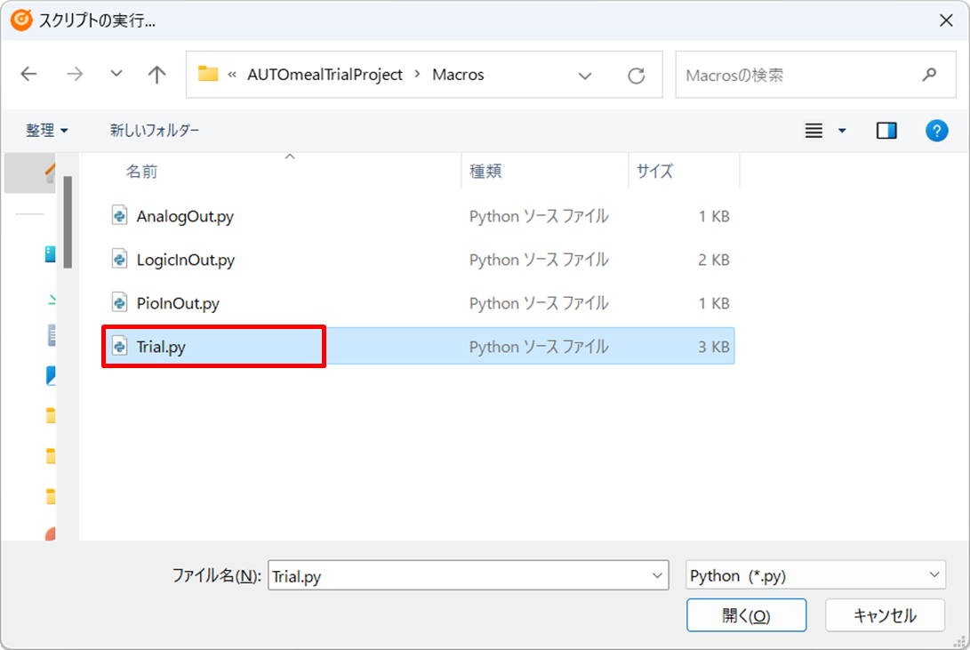 AUTOmeal では Python 形式のスクリプトファイルに自動化したい制御・計測・判定の命令を記述し、そのスクリプトを読み込むことでテストを自動化させることができます。