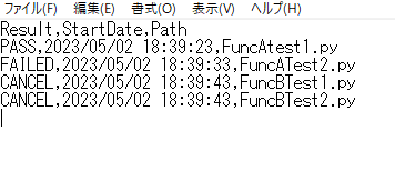 Result.csv には実行結果、実行日時、実行したスクリプト名が記載されています。