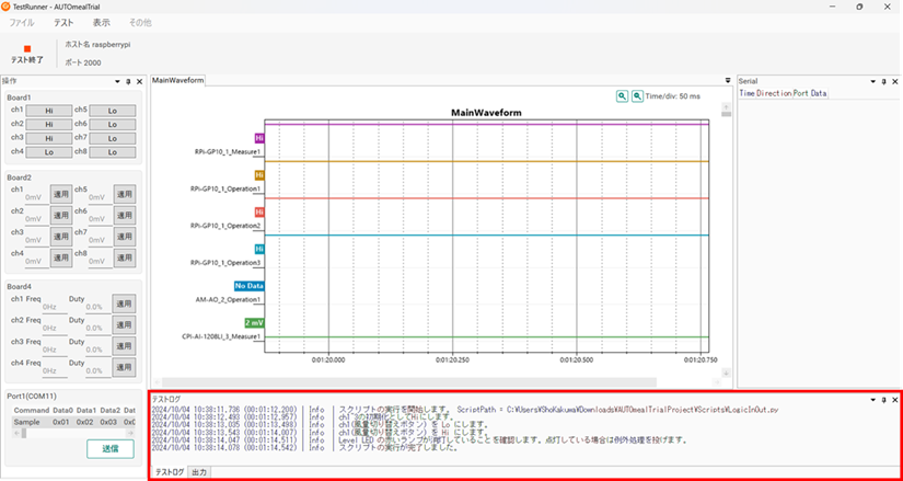 4. [テストログ] ペインに開始、完了の情報及び、スクリプトに記述したログが出力されます。