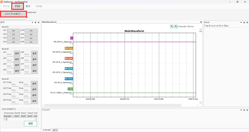 1. テスト実行中の状態で、メニューバーの [テスト] > [スクリプトの実行] をクリックします。