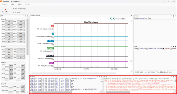 [テストログ] ペインに出力されたテスト実行時の動作ログはレポートファイル内に記録されます。