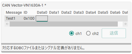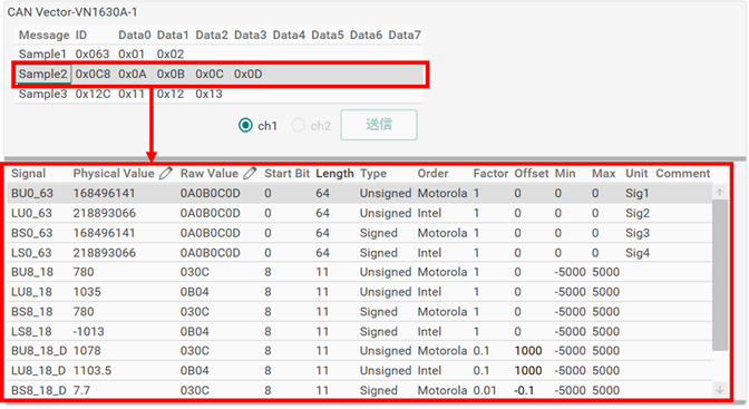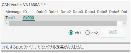 CAN 操作パネルの下部に DBC ファイルの内容を読み取り、[ID] に対応するシグナル定義が表示されます。
