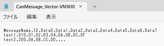GUI で編集した CAN メッセージは、CAN メッセージ定義ファイルに保存されます。CAN メッセージ定義ファイルは CSV 形式のファイルです。テキストエディタ等で直接編集できます。